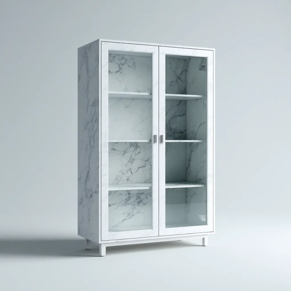 Matériaux et FabricationFabriquée en bois de qualité avec une finition effet marbre, cette vitrine arbore des portes en verre transparent pour un affichage clair. Elle est de couleur Blanche pour un look moderne et raffiné.